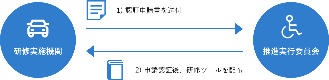 ユニバーサルドライバー研修の開催にあたっては、タクシー事業者およびタクシー関連団体などが「研修実施機関」となって、「ユニバーサルドライバー研修推進実行委員会」(全福協、全タク連)の認証を得たうえで行うことになります。