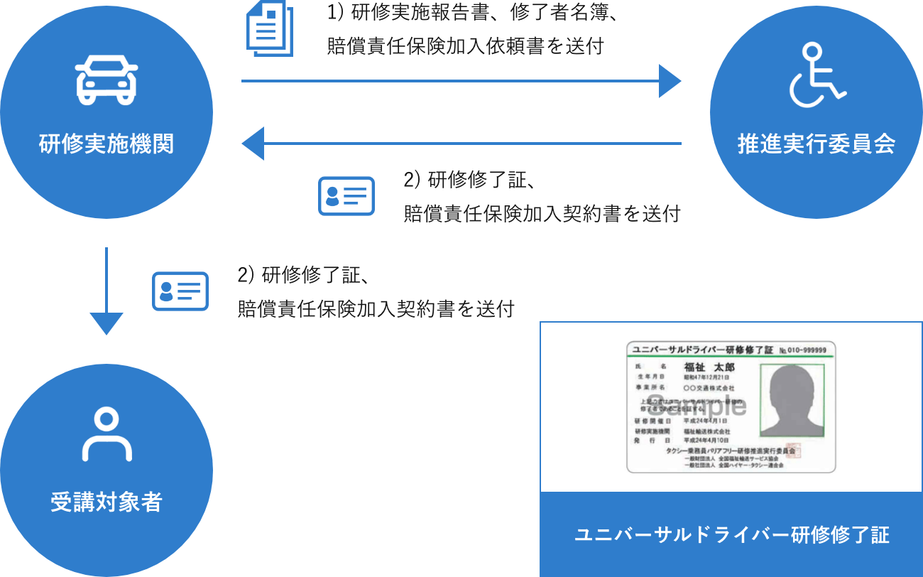 研修終了後、推進実行委員会に対して「研修実施報告書」により、各受講修了者の「ユニバーサルドライバー研修修了証」の交付申請を行います。